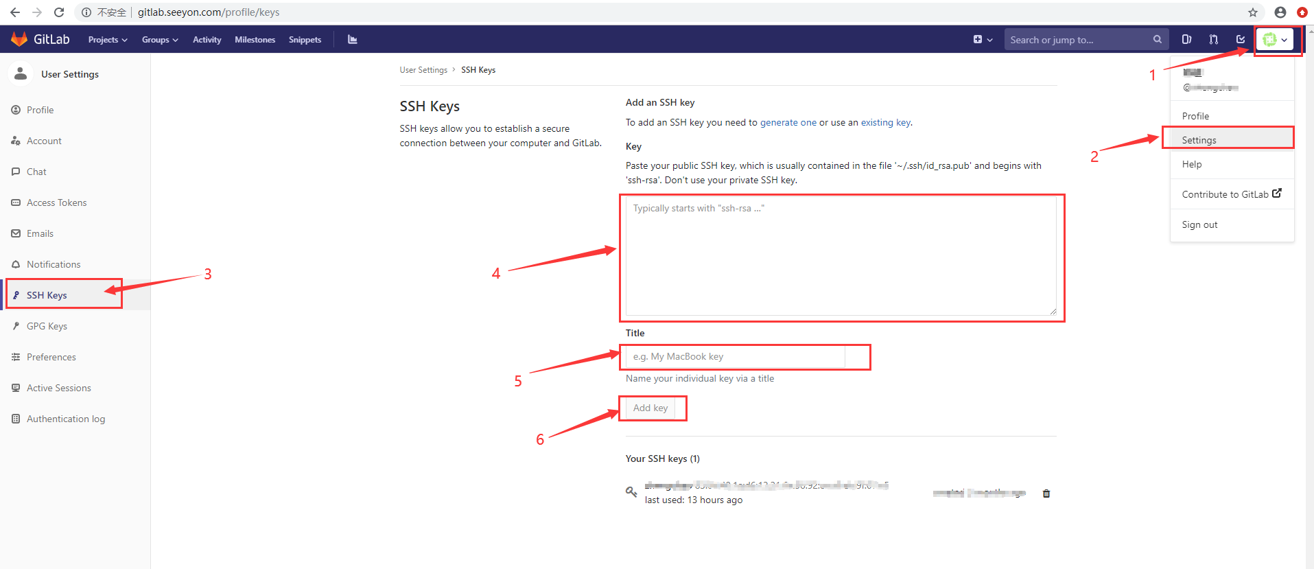 7、复制生成的公钥设置到gitlib的Settings->SSH Keys里面(以ssh-rsa开头,末尾去掉回车)