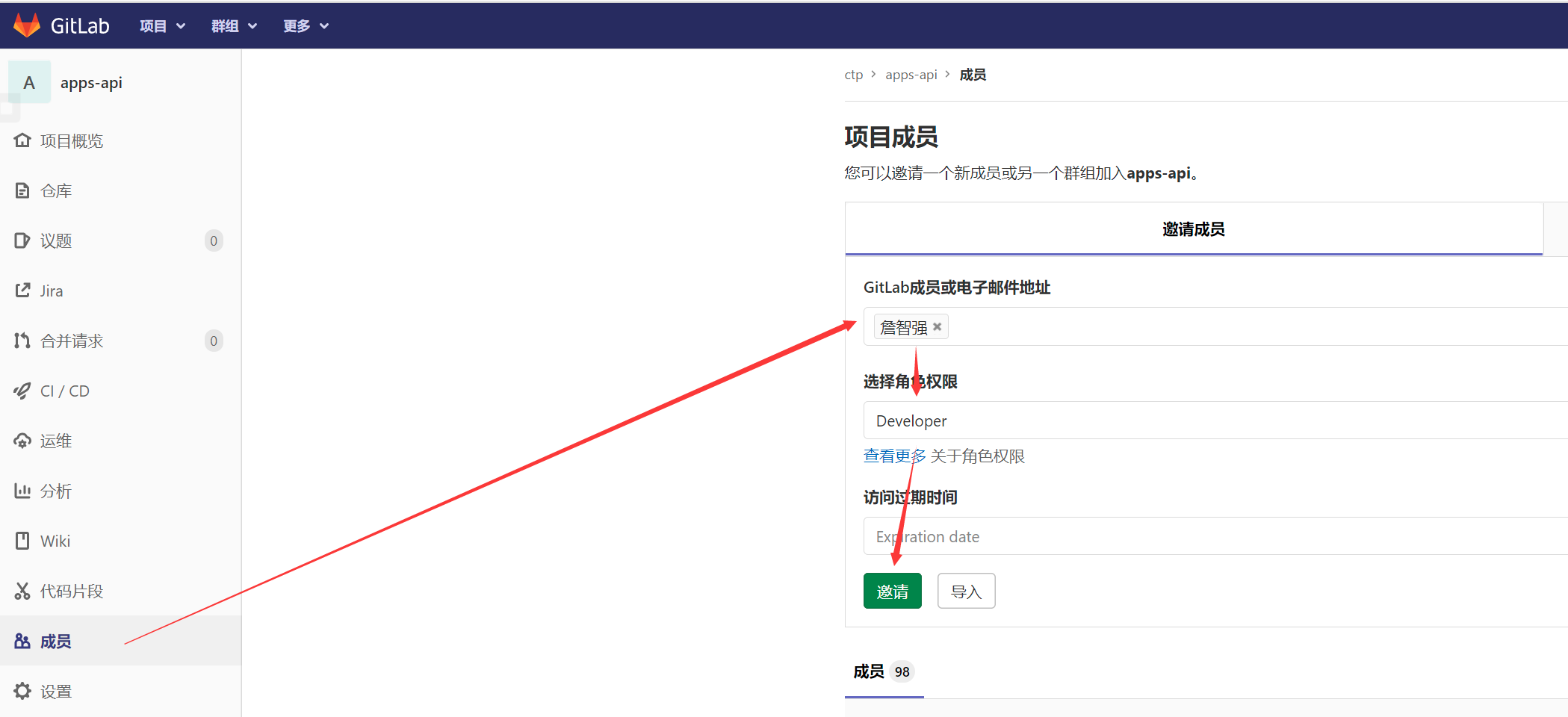 Owner或Maintainer可以对Gitlab工程进行授权,操作方式如下