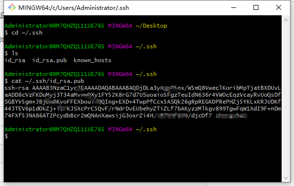 5、.ssh如果不做特殊处理的话,一般是在C:\Users\Administrator目录下。如果看不到.ssh文件,可以使用ls -ah指令查看隐藏文件夹即可,这是存放秘钥的文件,打开这个文件会看到id_rsa和id_rsa.pub。id_rsa是私钥文件,id_rsa.pub是公钥文件。