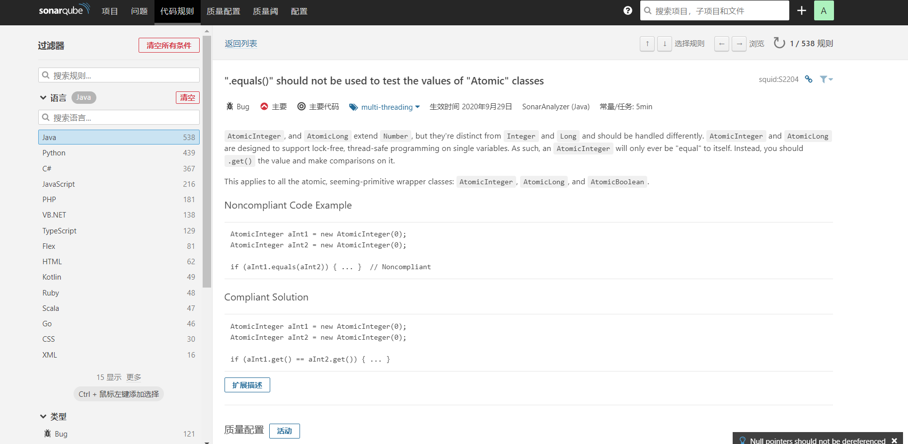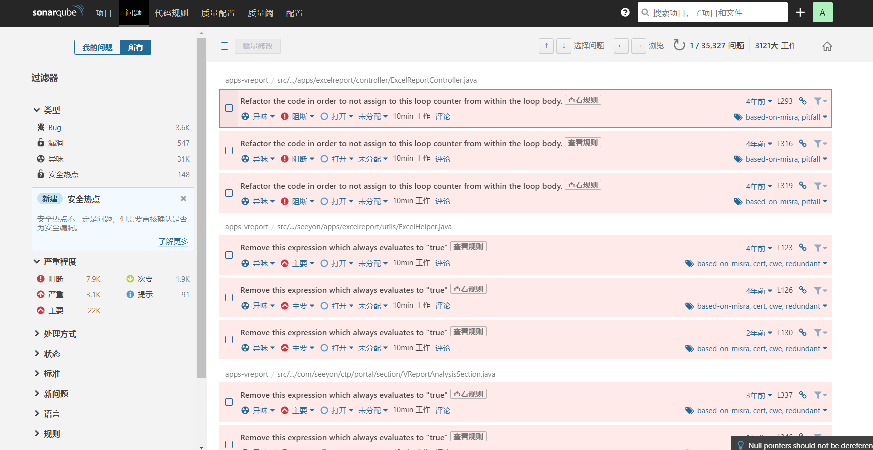问题是sonar通过安排的规则扫描出的触犯代码规则的问题代码。左边是规则的分类,按照类型、验证程度等维度进行了分类。右边为具体的问题代码段,点击进行可以查看整个代码文件以及对应的规则详情