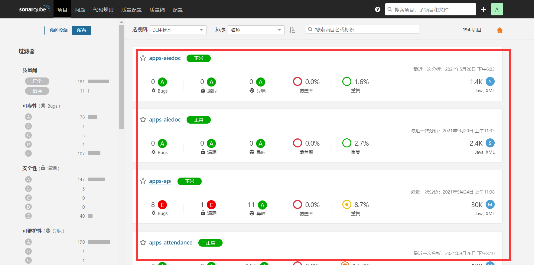 图中红色方框部分为各个项目模块的质量状态。主要观察维度是: