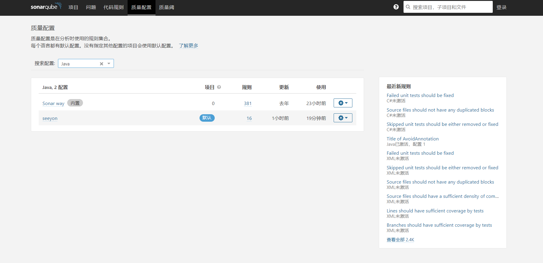 点击seeyon可以查看质量涵盖的规则。了解seeyon质量配置下的java文件代码规则