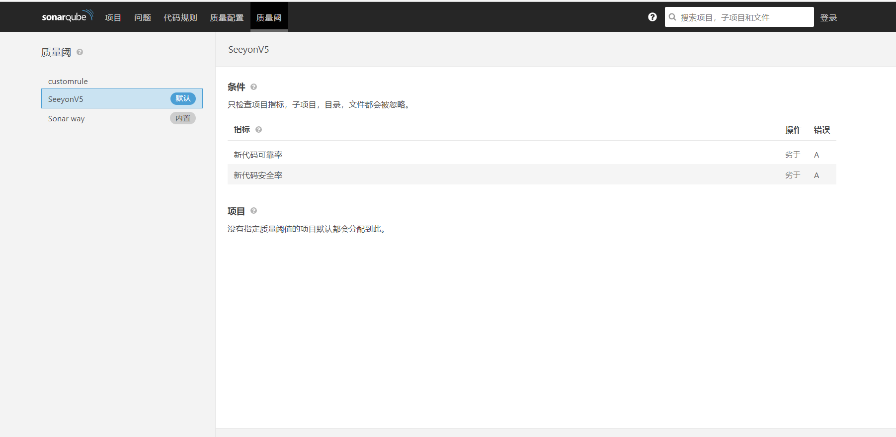 项目旁边的绿色字体正常为质量阈值规则检测的结果。他的作用是允许用户定义什么质量的统计结果视为检测通过。如Bugs和漏洞必须为0,安全性评级、可靠性评级为A