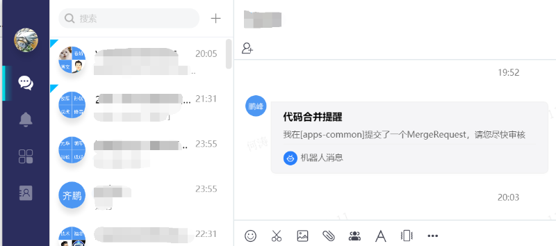 Gitlab是一个独立系统,代码合并人不可能随时在线关注合并请求,为了让合并人及时处理,我们在Gitlab上挂载了一个监控微服务,将每一例合并请求都发送到协同系统中,让Maintainer能及时收到合并消息并立即处理。