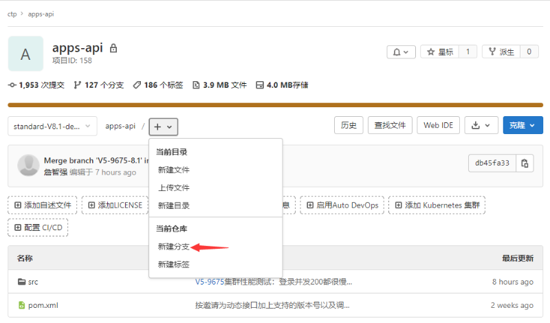 1)首先要确认自己本次代码合并的目标分支是哪一条,以V8.1为例,V8.1的开发分支为:standard-V8.1-develop