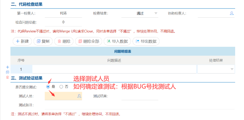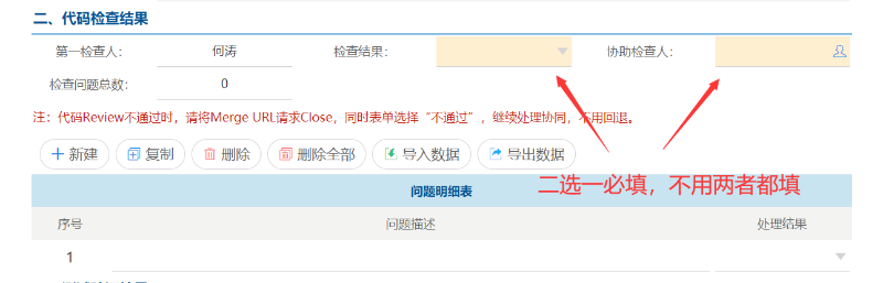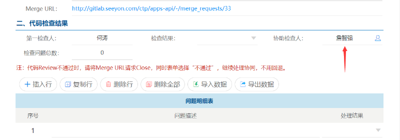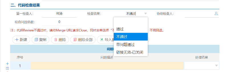 5)以上Gitlab操作完成之后,回到协同表单页面填写检查结果,检查结果包含:通过、不通过、链接无效几个选项,如果代码有问题并且被Close就选择不通过,并且备注不通过原因。