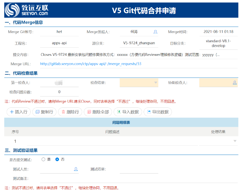 同行评审职责:同行评审人员可以点开merge request,检查代码变更记录,利用自己的经验再判定一下开发提交的代码是否正确,填写问题明细表。