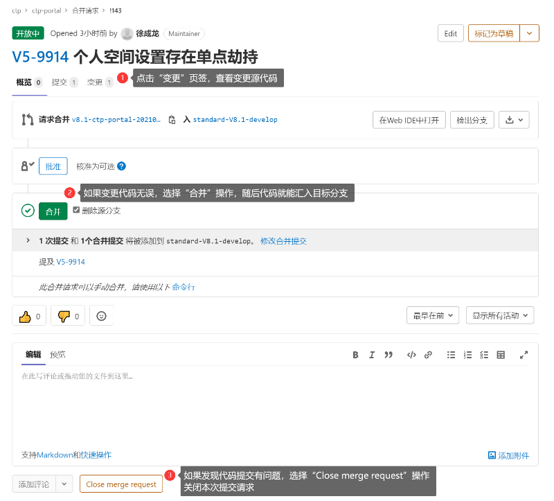 4)在Gitlab合并代码页面,Maintainer会显示如下界面,主要关注如下1、2、3三个位置的操作按钮: