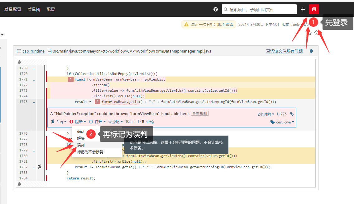 如果你的代码没有问题,被sonar检测错了,可以告知自己的Master,通过Master帐号登录,标记为“误判”↓↓↓
