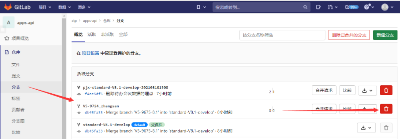 删除分支,如果合并过程没有删除私人分支,你还可以通过如下操作进行删除: