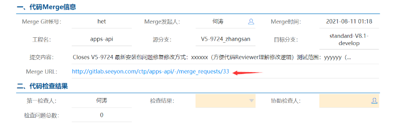 3)如果你要自己检查代码,代码检查人通过表单上面的Merge URL直接打开Gitlab