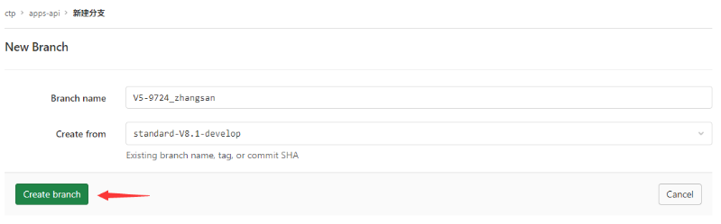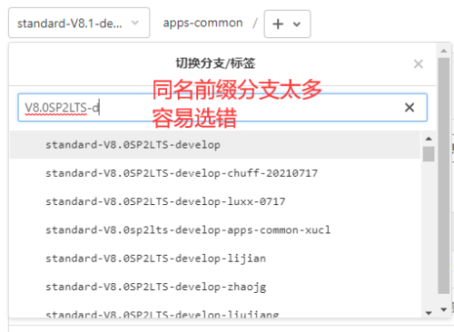 请不要以源分支名做前缀(如standard-V8.1-develop_zhangsan,这是不允许的!),如果后续不及时清理会导致非常多的干扰分支,影响开发使用。