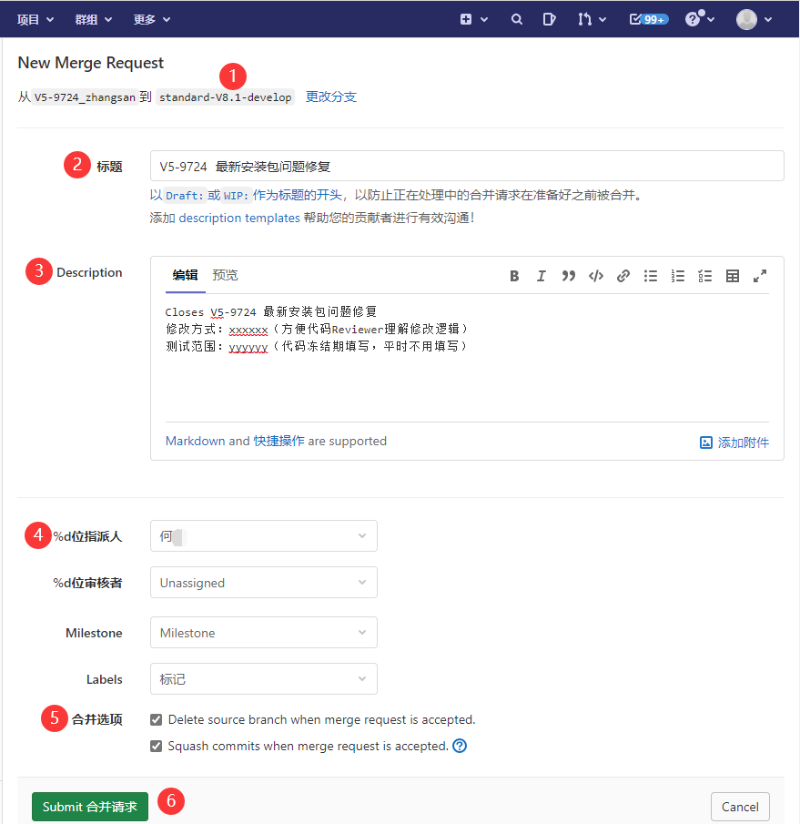 ④指派人:就是代码检查人,我们已经将合并请求与公司系统打通(后面内容介绍)。不选择指派人则默认流转到project工程负责人,如果自己选择了指派人,则会将合并请求流转给自己指定的指派人手里。
