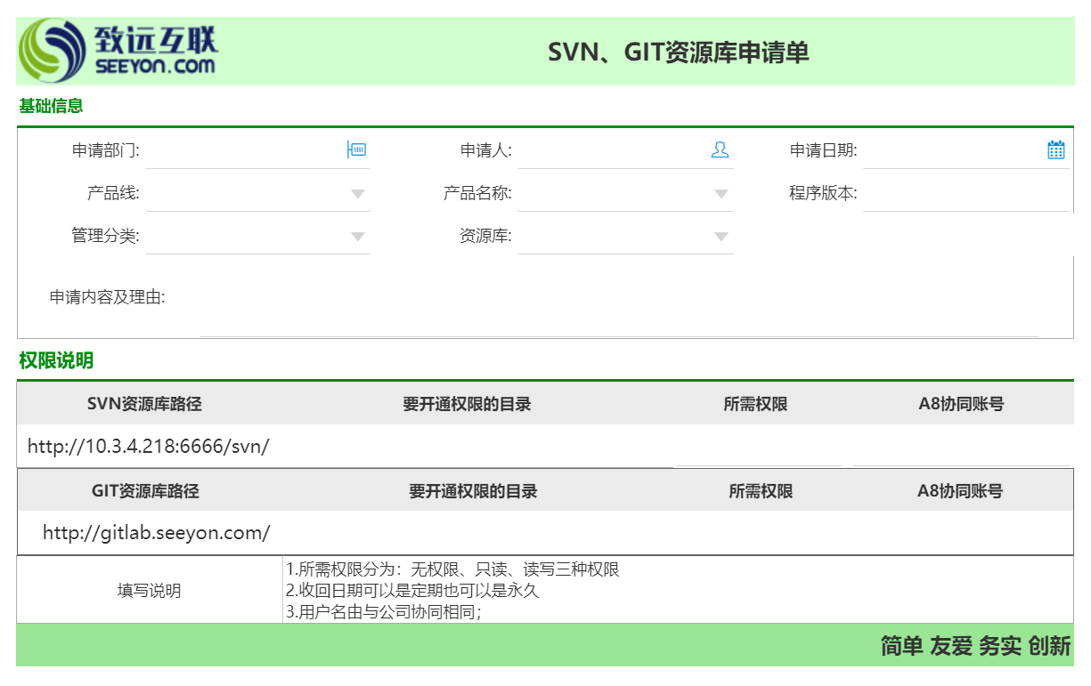 如果没有相关SVN或Git权限,请使用公司系统发起《svn-git权限管理单》申请: