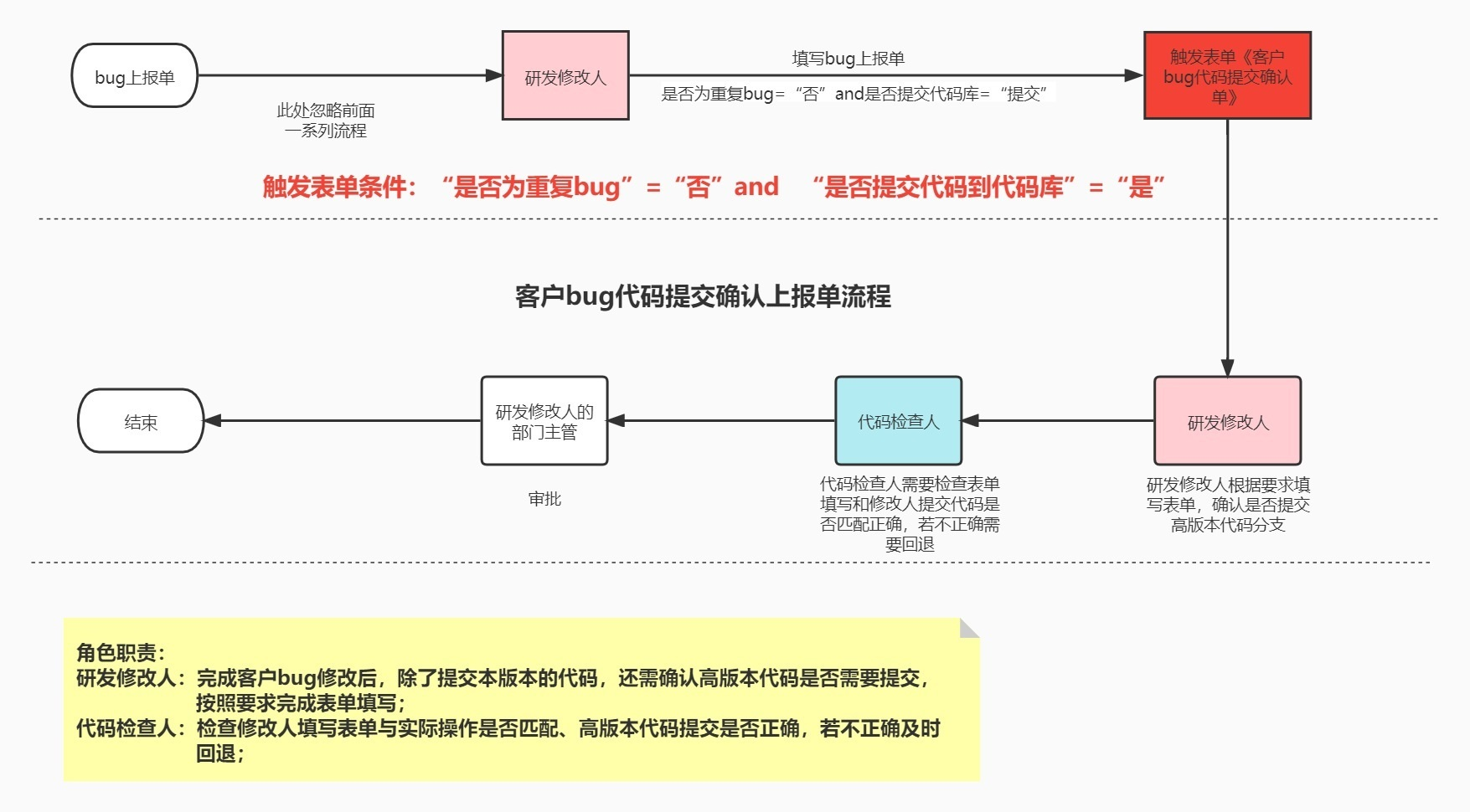 执行逻辑图如下:当选择“是否为重复BUG=否 and 是否提交代码仓库=是”时就会触发一个新的表单。