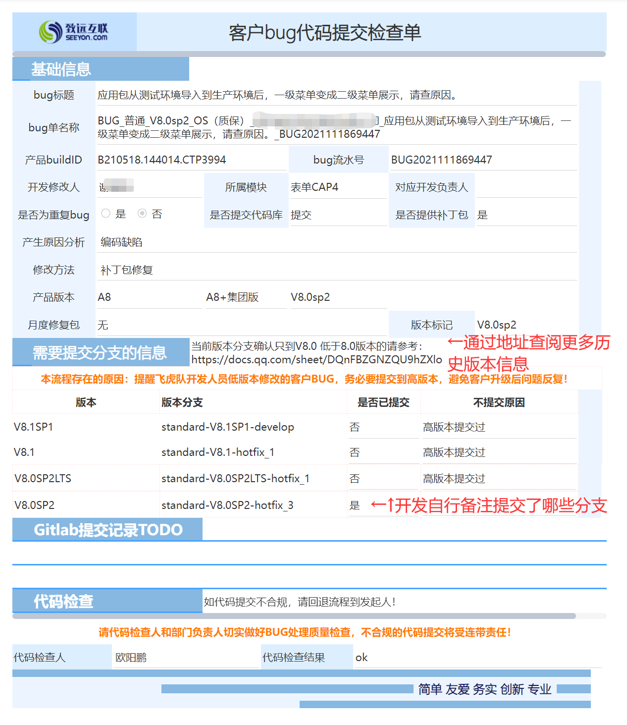 为了降低这种失误发生率,我们改进了流程:当BUG单中选择了“是否为重复BUG=否 and 是否提交代码仓库=是”时会自动触发一个《客户bug代码提交检查单》。《客户bug代码提交检查单》的作用是:告知各位开发当前是什么版本,当前需要提交哪些分支。