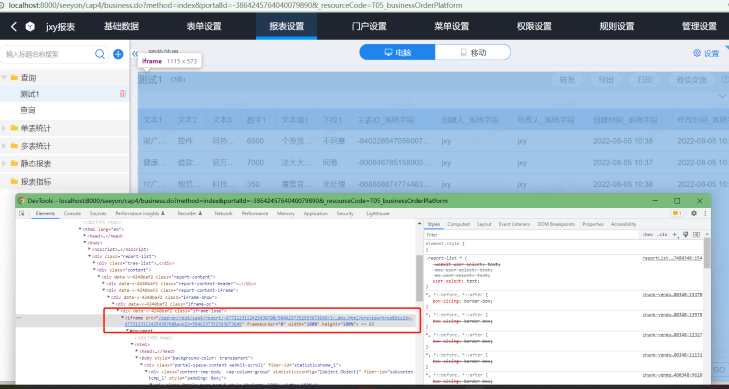 报表设置页签,左侧和右侧设置,整体页面框架在report_design工程,内部查询、统计列表嵌入iframe