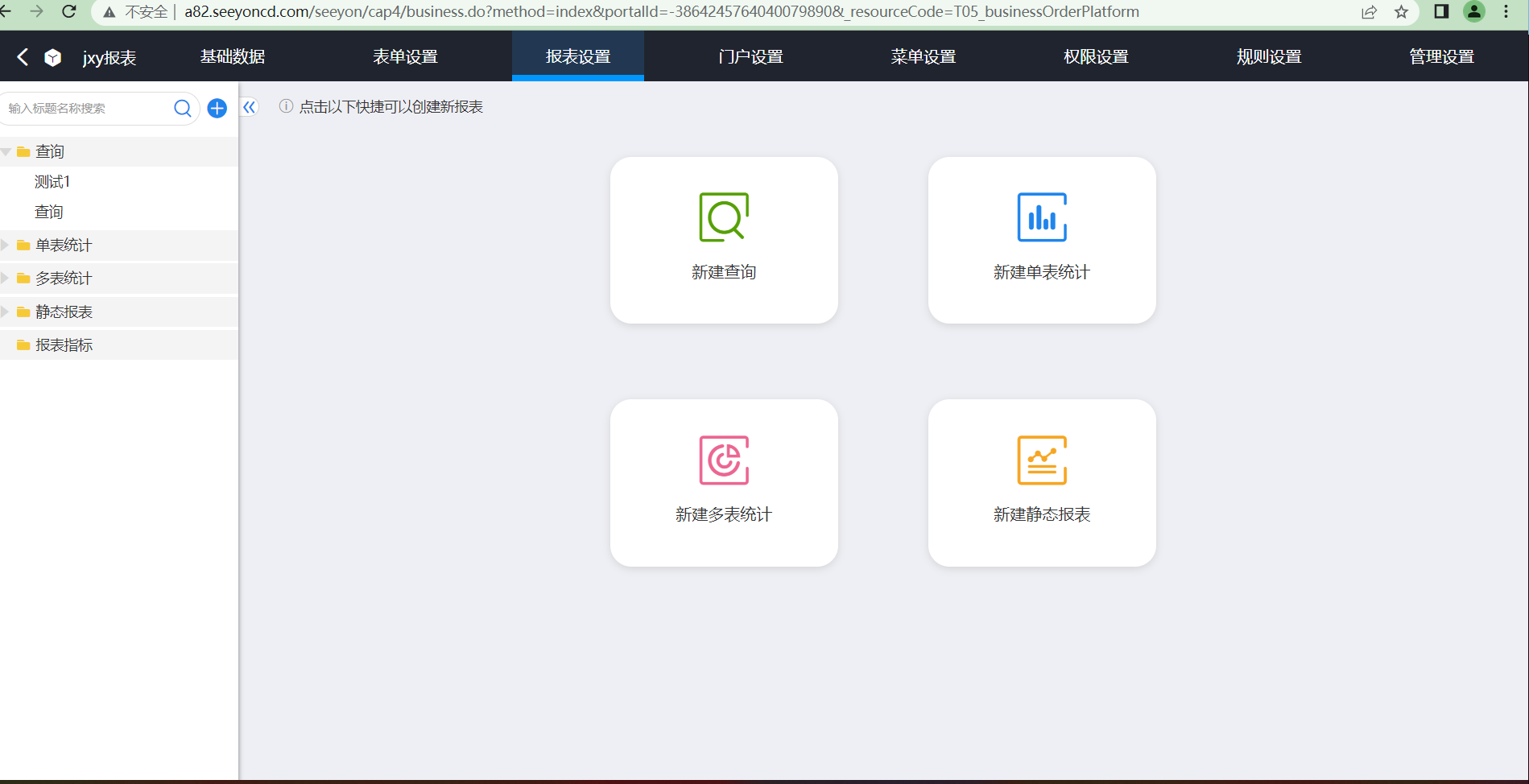 报表分类:查询、单表统计、多表统计、静态报表,每种报表可以自定义数据源、标题、排序、穿透、数据字段等
