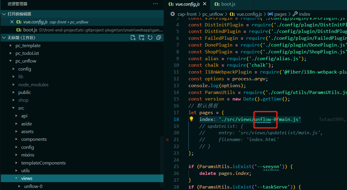 在vue.config.js中添加我们新的模板对应的命令,将红框部分复制一份换成我们新模板对应的打包命令名称以及文件路径即可。