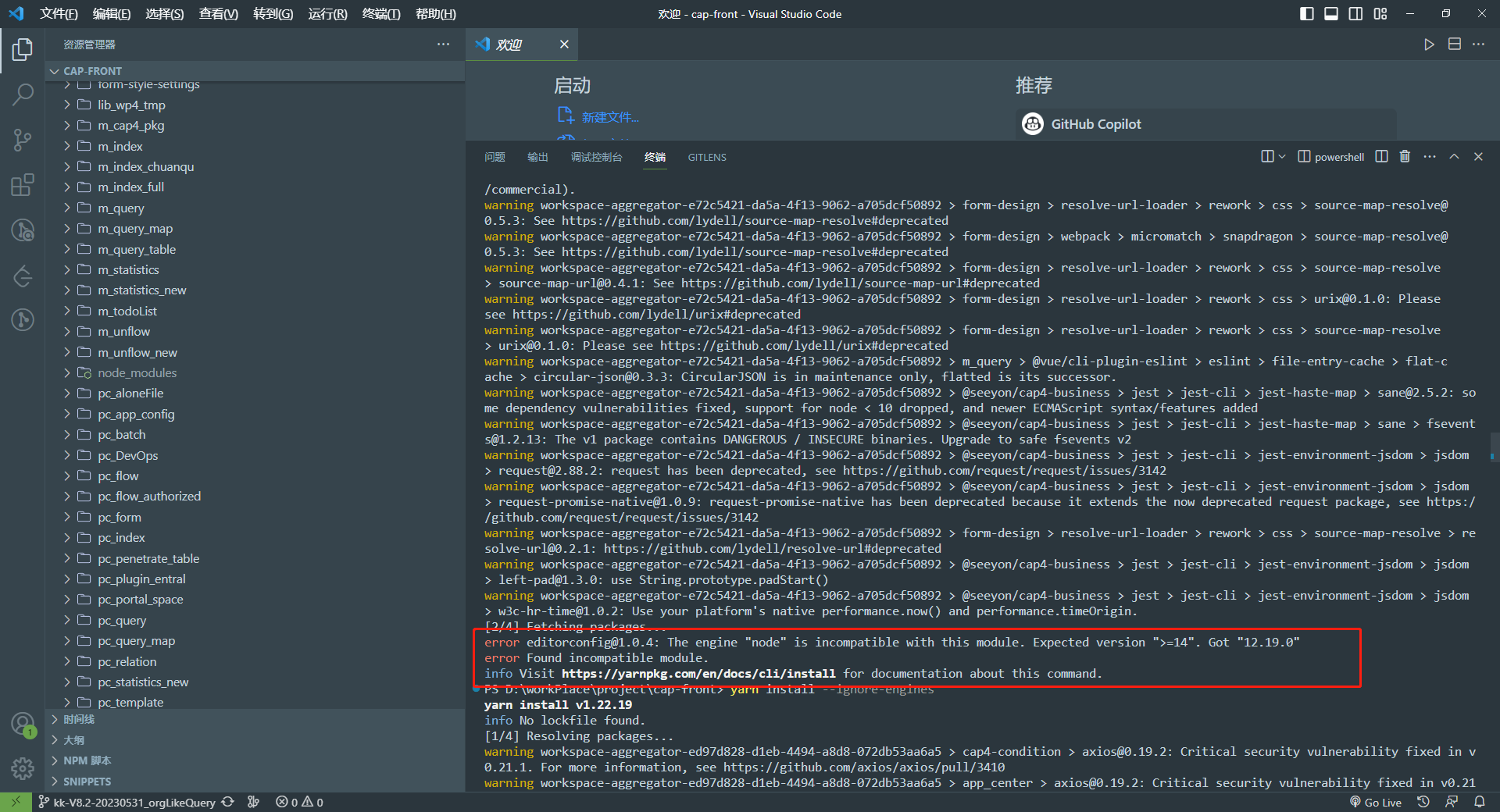 解决:cap-front目录 执行npm i -g yarn 再执行yarn install --ignore-engines
