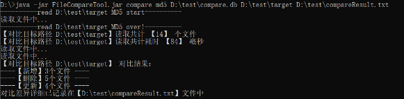 java -jar FileCompareTool.jar compare md5 D:\test\compare.db D:\test\target D:\test\compareResult.txt