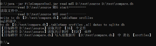 java -jar FileCompareTool.jar read md5 D:\test\source D:\test\compare.db