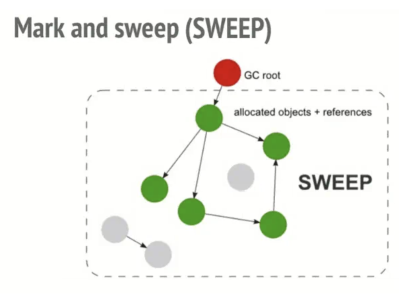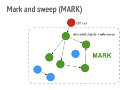 然后,从所有根节点出发,遍历其可以访问到的子节点,并将其标记为活动的。根节点不能到达的地方即为非活动的,将会被视为垃圾
