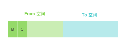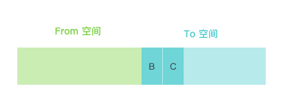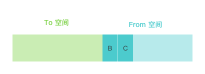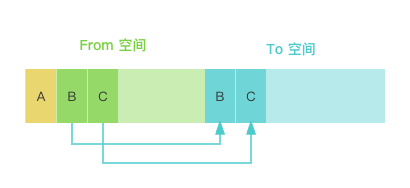 第一次垃圾回收时,对象 A 已经没有其他引用,则表示可以对其进行回收;对象 B、C 依旧处于活跃状态,因此会被复制到 To 空间中进行保存
