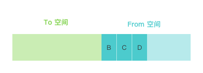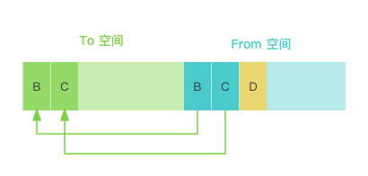 第二次垃圾回收时,对象 D 已经没有其他引用,则表示可以对其进行回收;对象 B、C 依旧处于活跃状态,再次被复制到 To 空间中进行保存