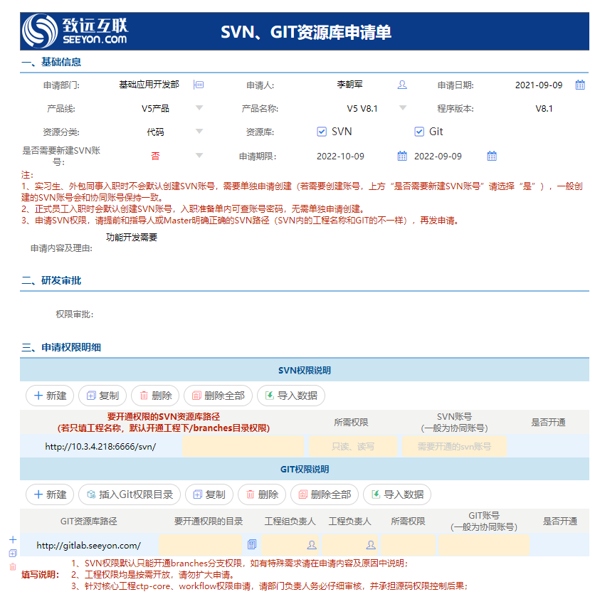 3、填写文单,目前大部分代码已迁移至git,极少部分还在svn。