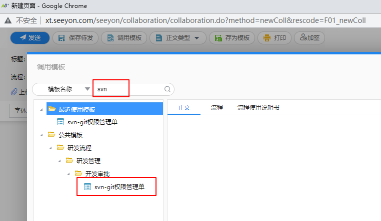 2、搜索模板名称,输入关键字“svn”,选择"svn-git权限管理单"